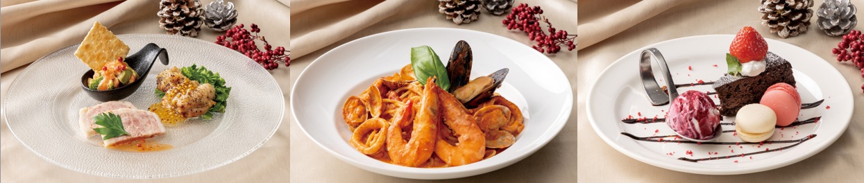 華やかな前菜や自家製フォカッチャ、海の幸たっぷりのパスタ、そしてクリスマスらしいデザートまで、特別なひとときを彩る内容です。